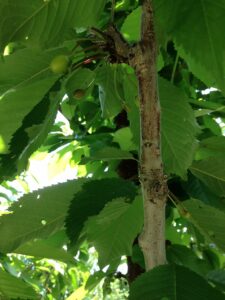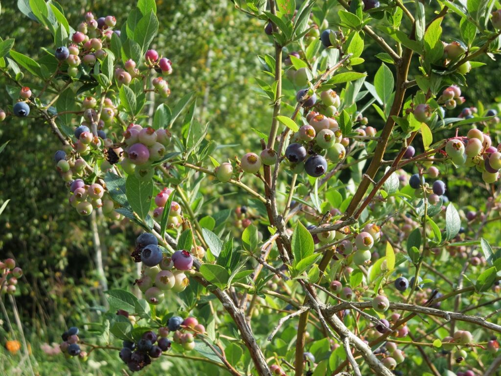 ブルーベリー今年も実が付いてますが、雨が多いのか実割れがみられ蜂が果実を吸っています。